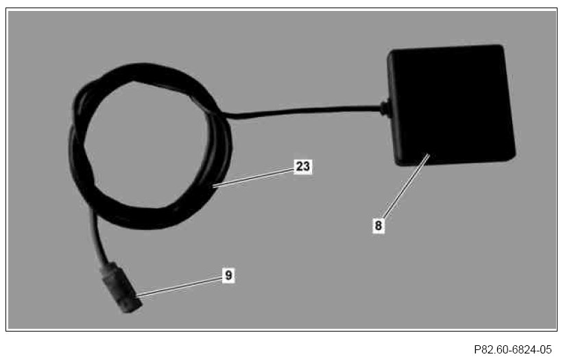 1 Lay the control unit in the right front footwell and contact with the connector of the GPS-antenna (9).