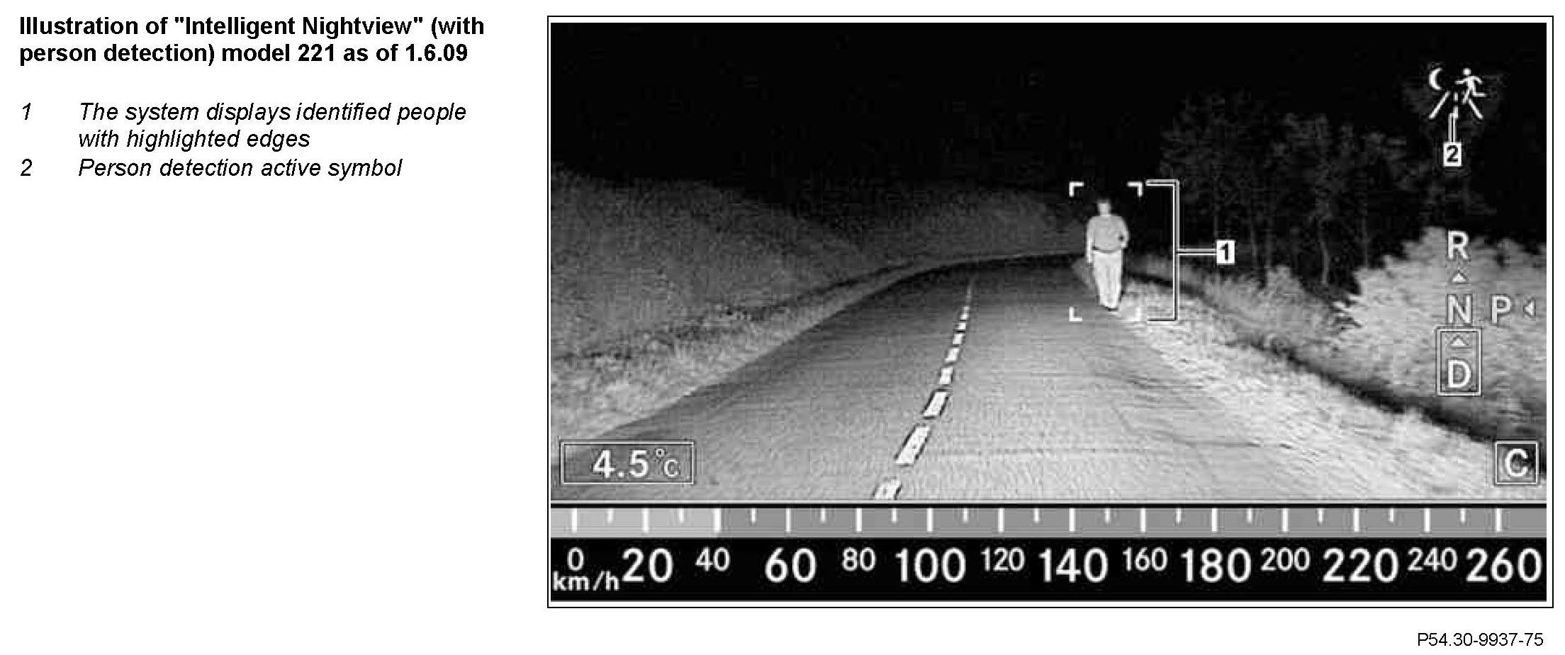 Person detection functionality has been added to the Night View Assist system on model 221, so individuals who are moving on dark roads outside the city limits may be identified.
