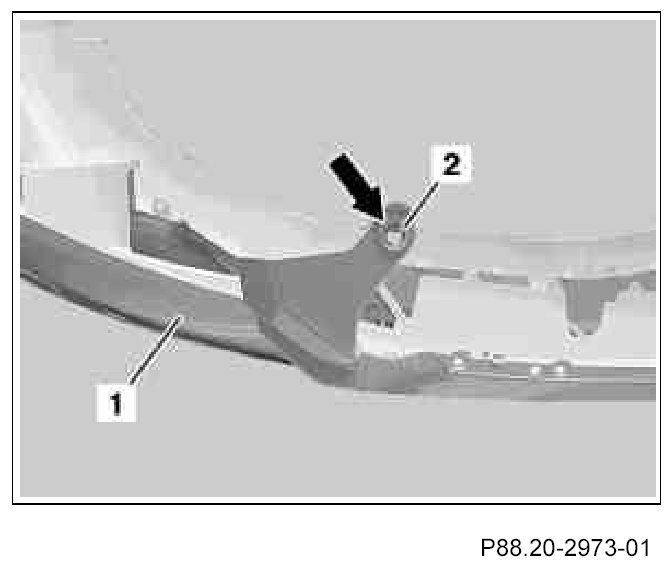 1. Insert fitted sleeves (2) into mounting holes in front bumper paneling (1) (see arrow).