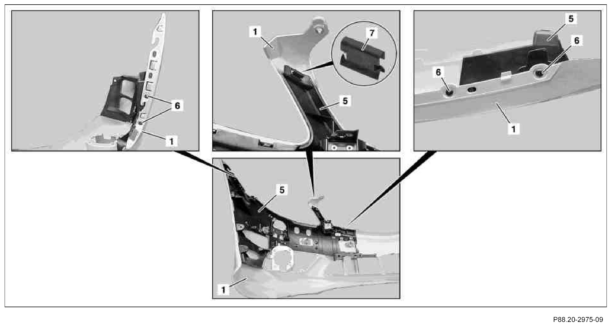 4. Fasten front bumper basic carrier (5) on right and left with four expansion rivets (6) each and one holddown clip (7) in front bumper paneling (1).