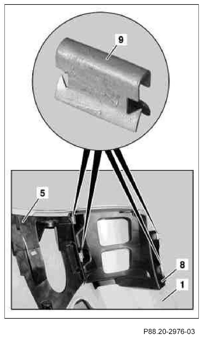 5. Insert reinforcements (8) on right and left into front bumper paneling (1) and fasten with four holddown clips (9) each.