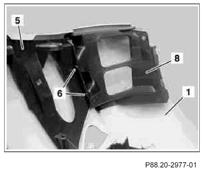 6. Fasten reinforcements (8) on right and left with two expansion rivets (6) each to front bumper basic carrier (5)
