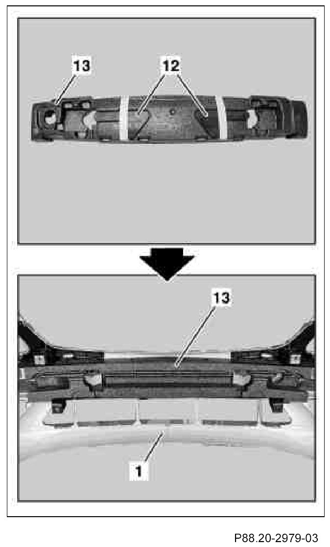 10. Insert center impact absorber (13) into front bumper paneling (1).