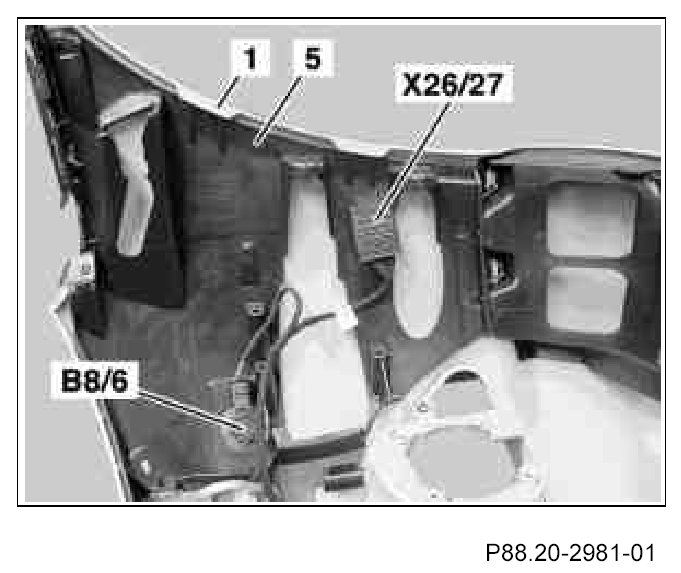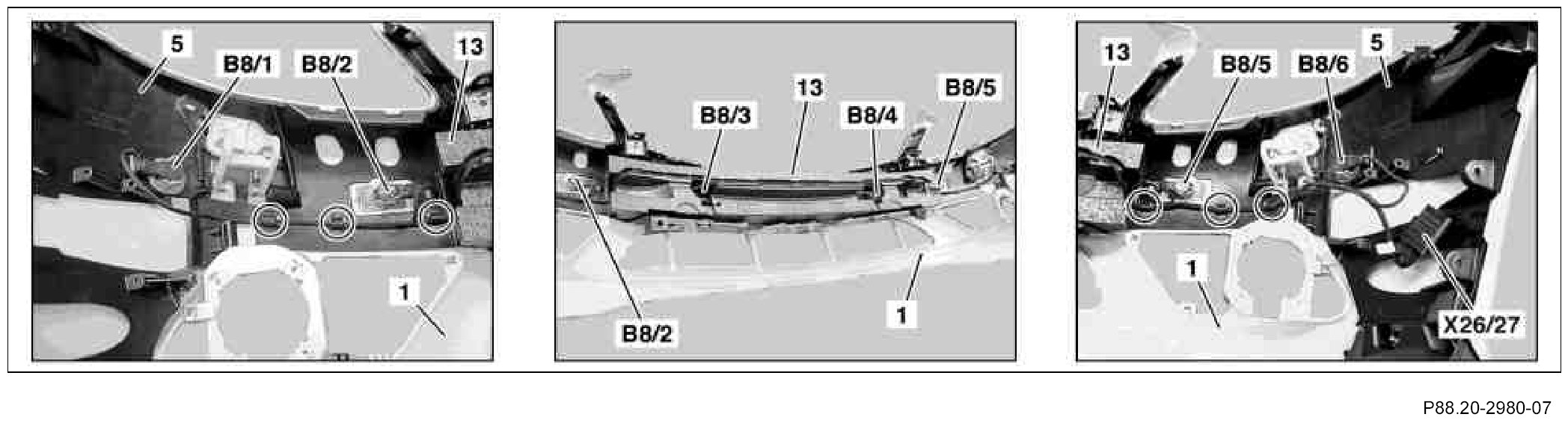 13. Arrest front bumper PTS connector (X26/27) on front bumper basic carrier (5) at right.