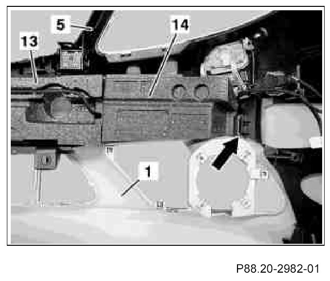 14. Insert outer impact absorber (14) on left and right into front bumper basic carrier (5) and arrest (see arrow).