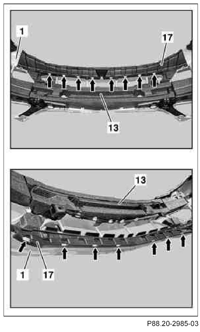 17. Insert bottom basic carrier (17) into front bumper paneling (1) and arrest (see arrows).