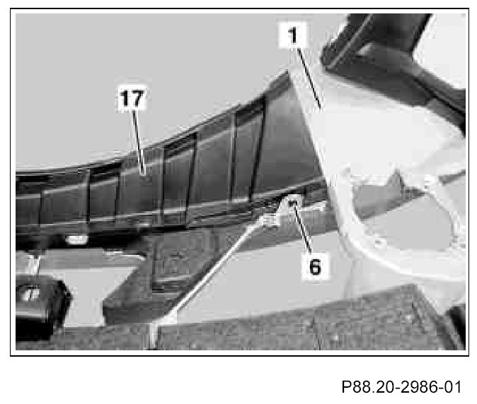 18. Fasten bottom basic carrier (17) on left and right to front bumper paneling (1) with two expansion rivets (6) each.