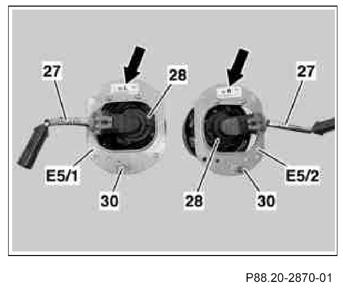 The left front fog lamp (E5/1) and right front fog lamp (E5/2) differ and are marked according to the side of the vehicle (arrows), the AMG wiring harness (27) for the front fog lamp should point toward the outside in the installed state.