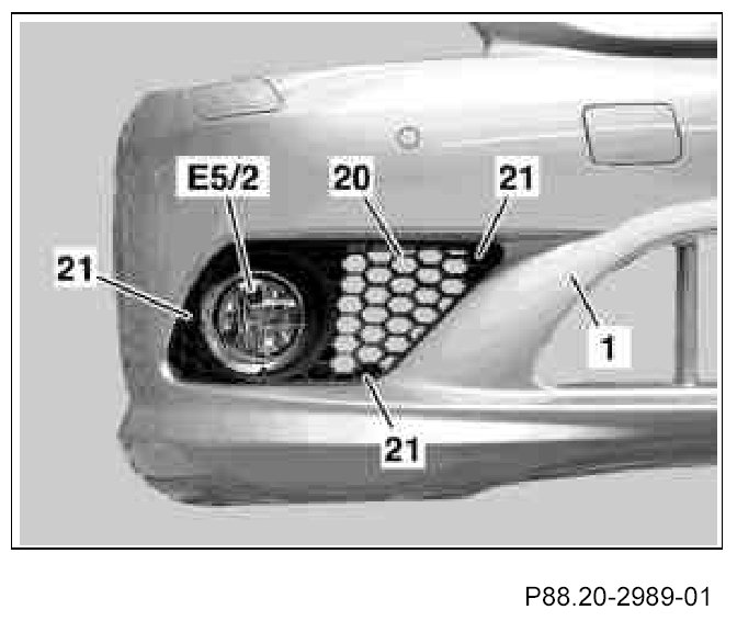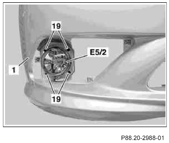23. Insert left front fog lamp (E5/1) and right front fog lamp (E5/2) at front into front bumper paneling (1), align and fasten using four 4.2 x 13 sheet metal screws (19) each.