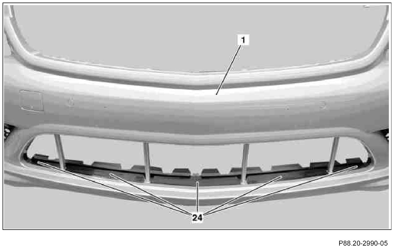3. Insert front bumper basic carrier (5) on right and left into front bumper paneling (1).