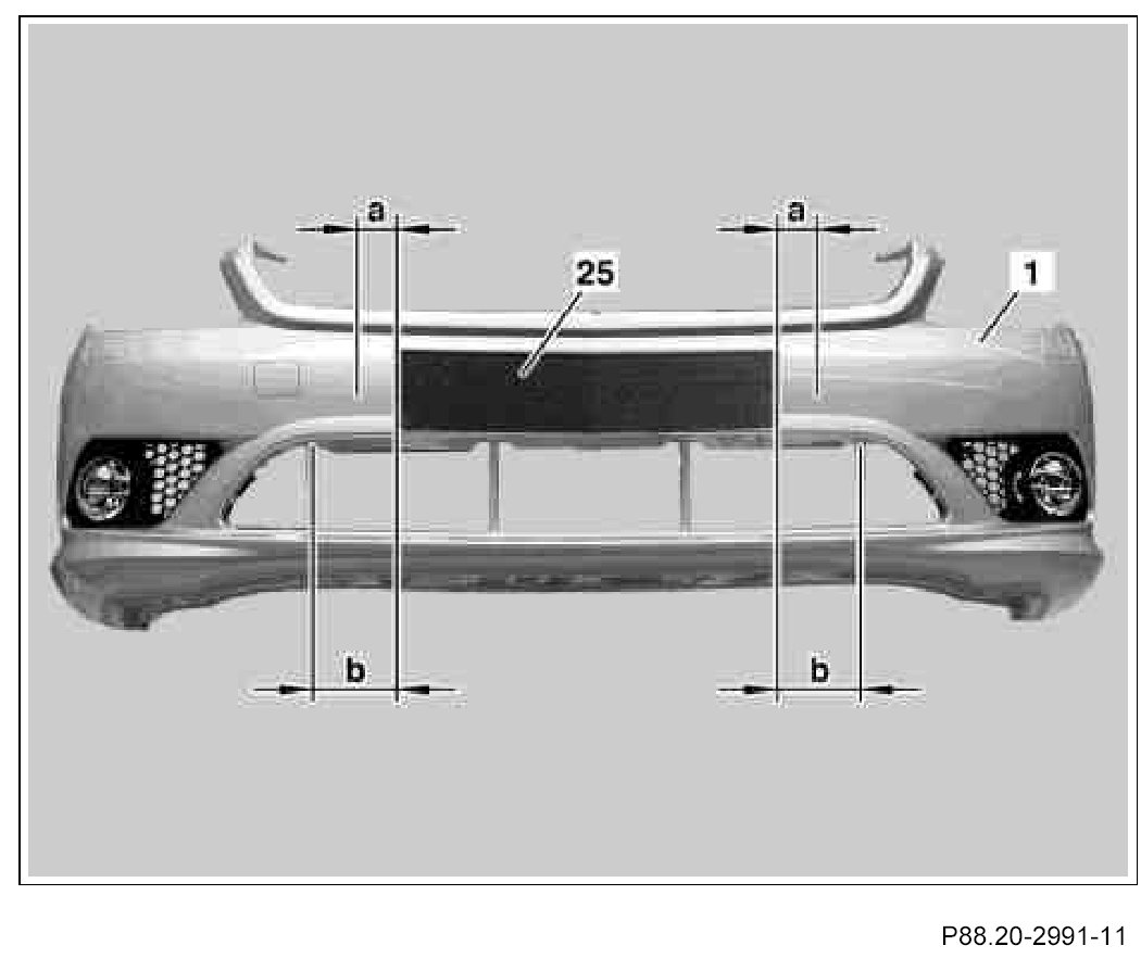 Use license plate frame (25) as template for marking holes. The distance (a or b) between the license plate frames (25) and the measuring points must be the same.The inner ultrasonic sensors (a) or the outer struts of the center air passage (b), center distance, serve as measuring points.Align license plate frame (25) on contour of front bumper paneling (1).