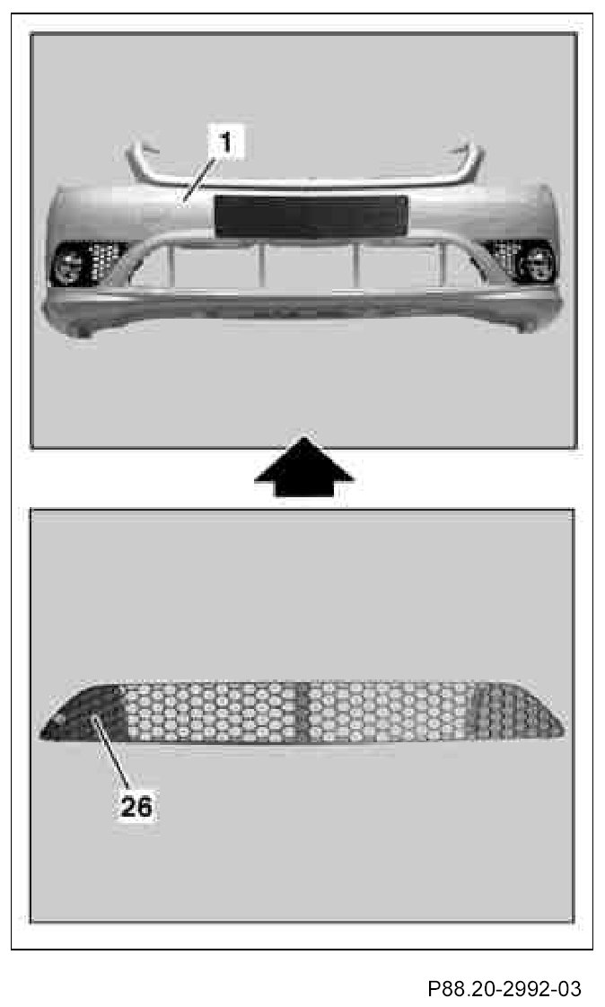 28. Insert center air inlet grate (26) into front bumper paneling (1).