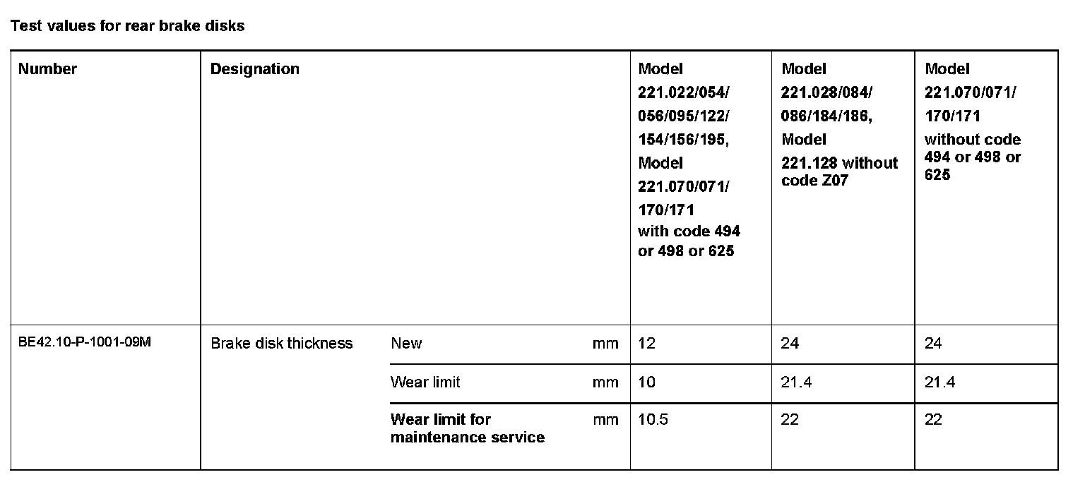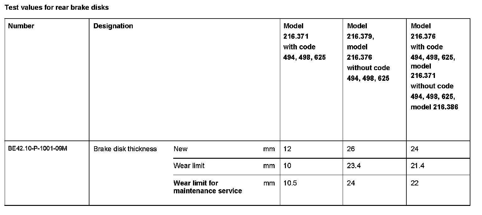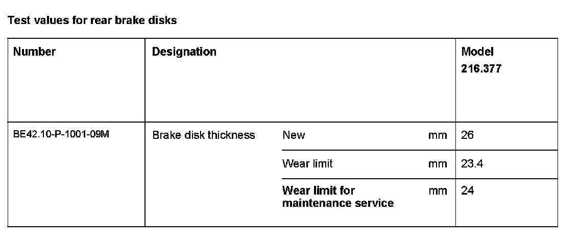 BE42.10-P-1000-09M Test values for rear brake disksTest Values For Rear Brake Disks: