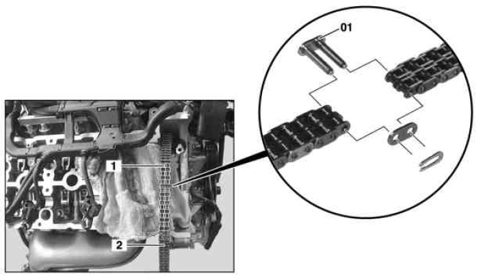 6 Detach the assembly link (01), and separate the old timing chain (1) from the new timing chain (2).