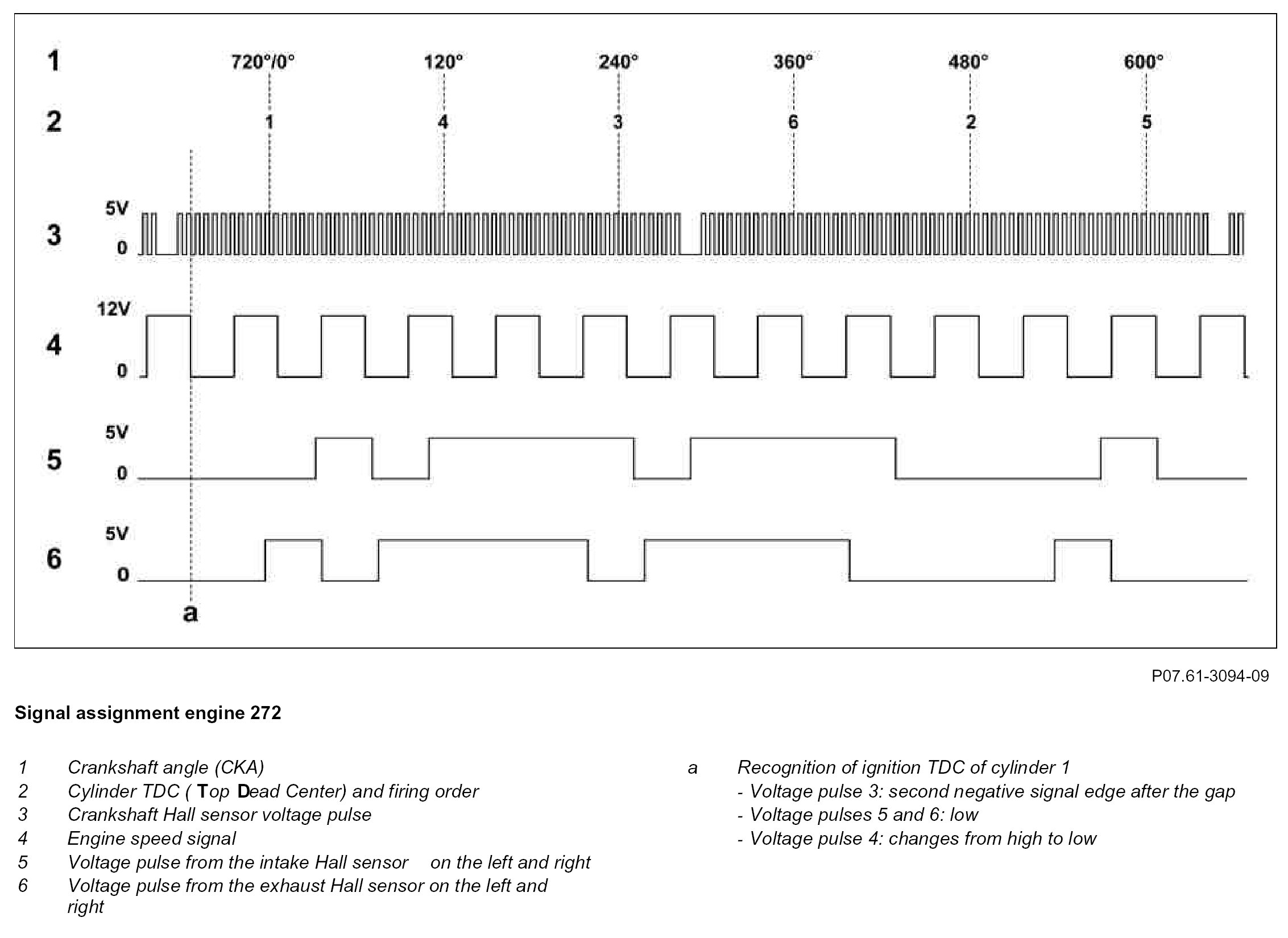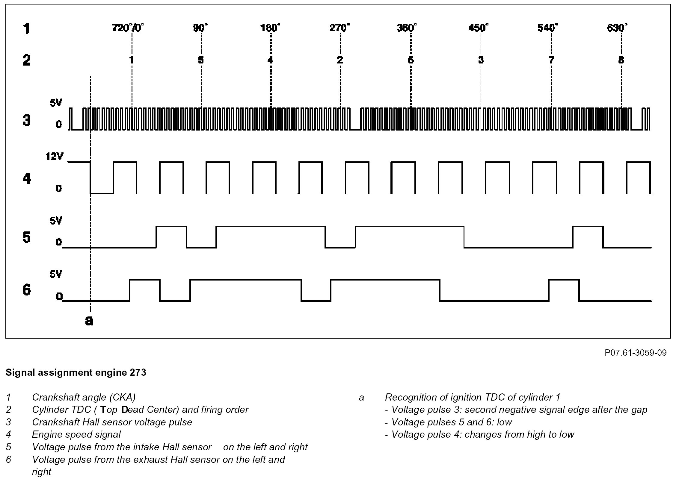 At the 2nd negative signal edge following the gap in the signal from the crankshaft Hall sensor, the ME-SFI [ME] control unit detects the TDC position in cylinders 1 and 6. If the signal from an intake camshaft Hall sensor is at 0 V (low) at this time, the ME-SFI [ME] control unit processes it to detect ignition TDC in cylinder 1.