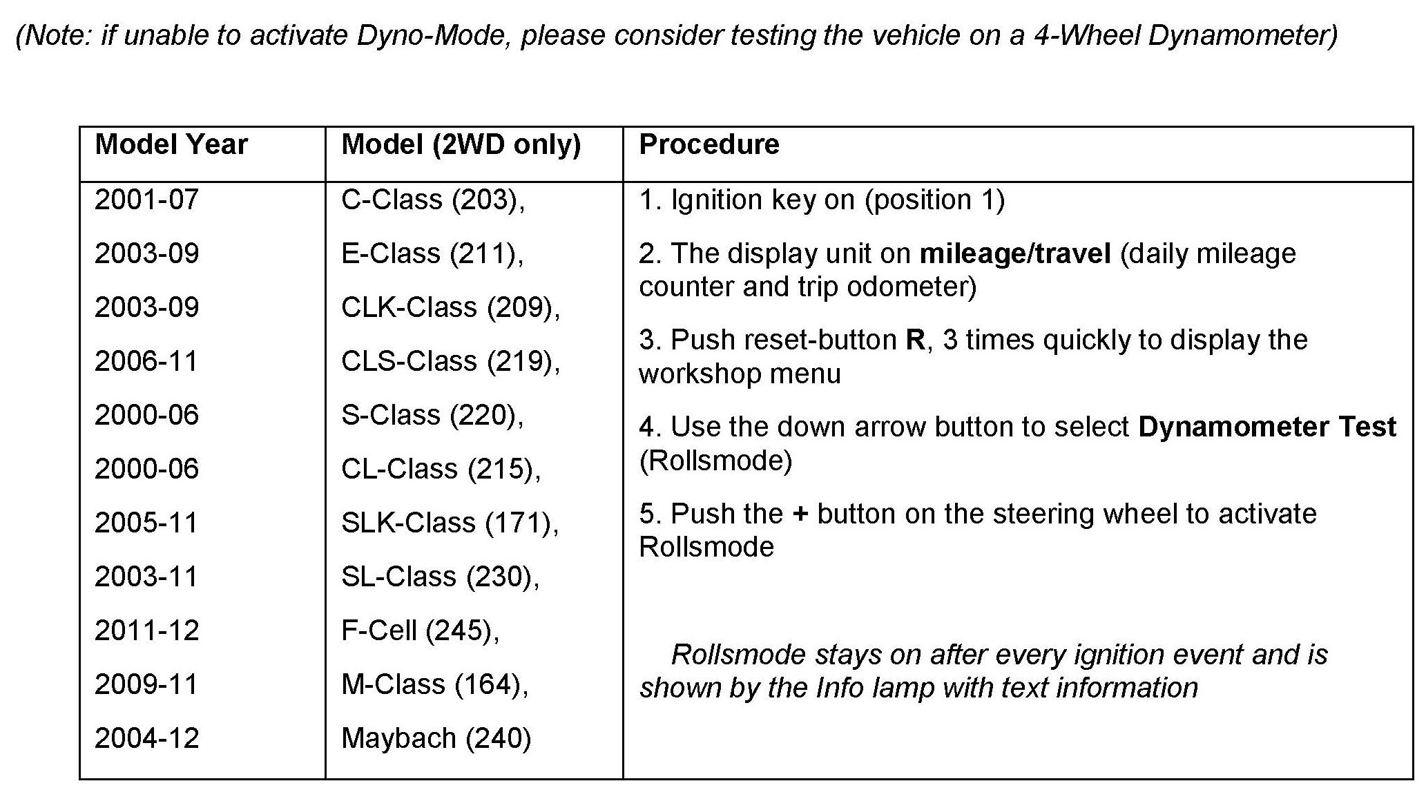 ^ Mercedes-Benz vehicles that are 2WD and do not have "Dyno-Mode" capability