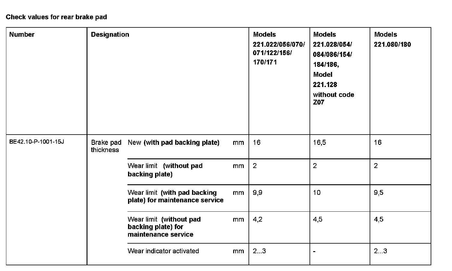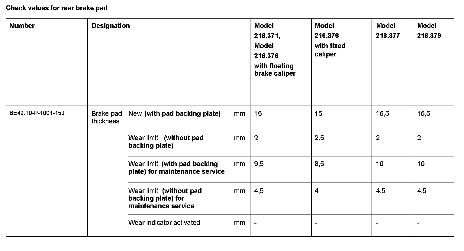 BE42.10-P-1000-15J Check Values For Rear Brake Pad