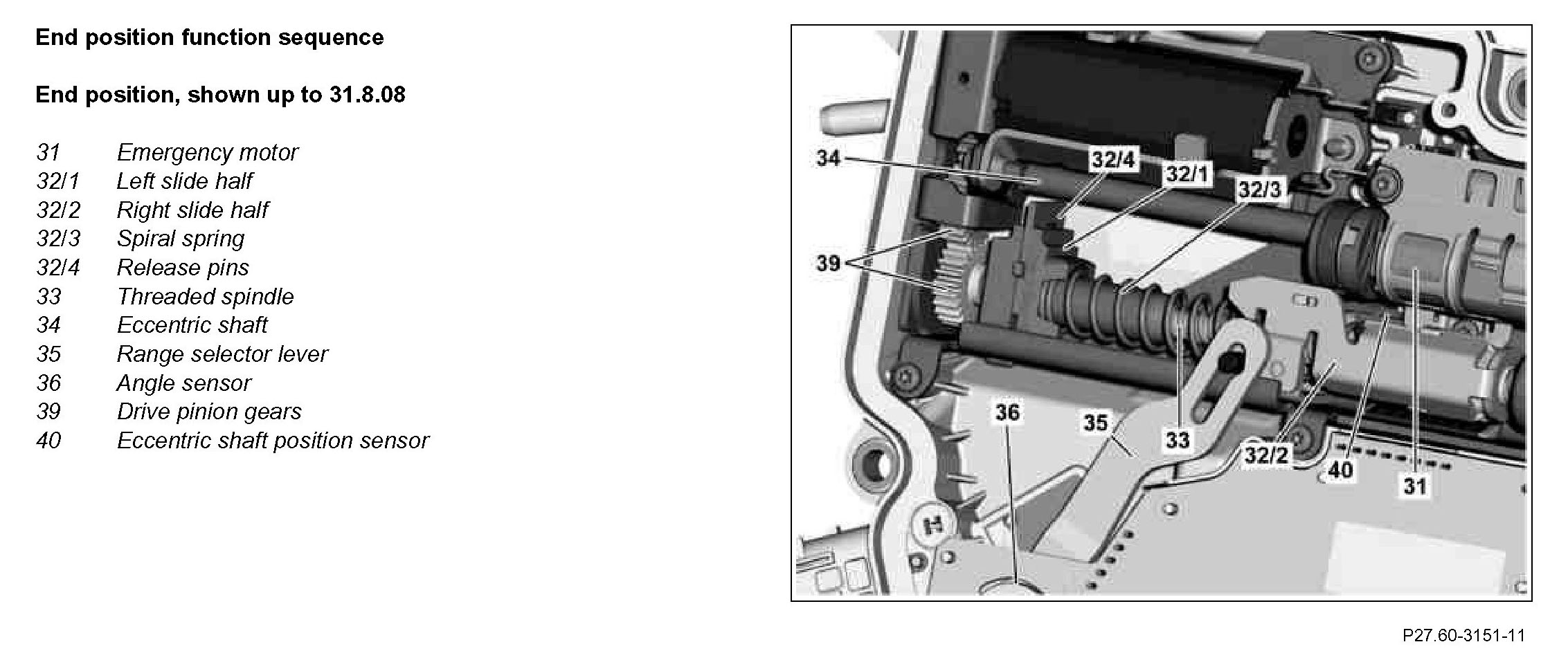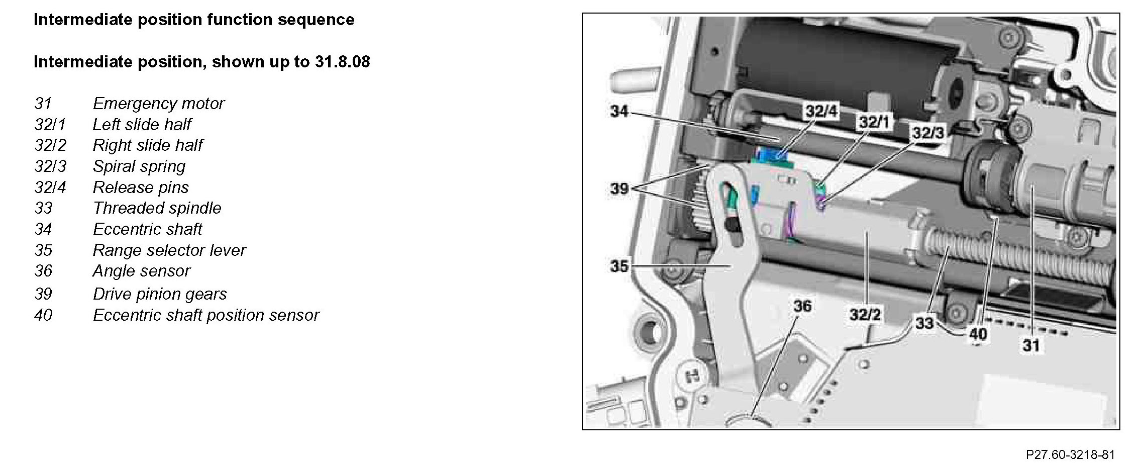 The pre-compressed coil spring pushes the two carriage halves apart. The right carriage half slides along the threaded spindle to the right and pushes the range selector lever to position "P". The eccentric shaft continues to rotate, until the emergency motor is no longer actuated. The actual position of the eccentric shaft is recorded by the eccentric shaft position sensor.