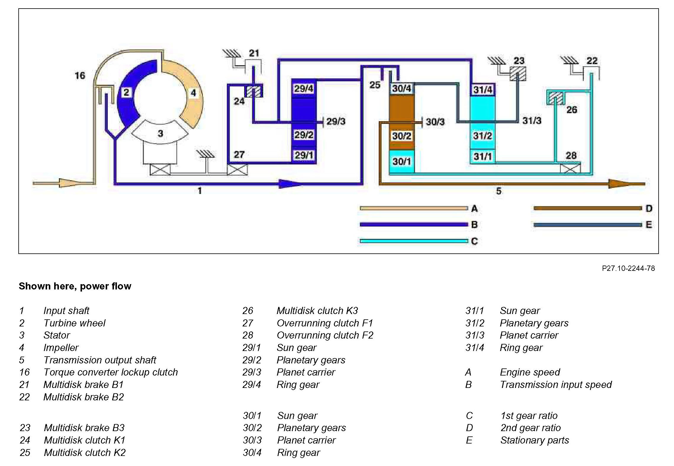 The planet carrier is held securely at the transmission housing by the engaged multidisk brake B3 (23)31/3 The ring gear (31/4) rotates at the transmission input speed (B) due to the mechanical connection to the locked planetary gear set. The planet gears (31/2) turn between the ring gear (31/4) and the sun gear (31/1). Due to the held planet carrier (31/3) a direction reversal takes place so that the sun gear (31/1) turns in the opposite direction to the direction of engine rotation.