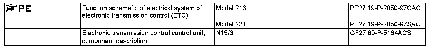 The kickdown function is activated as of a pedal travel > 90 %. The "kickdown" signal is transferred to the ETC [EGS] control unit by the CDI control unit (N3/9) or ME-SFI [ME] control unit (N3/10) via the drive train CAN. Based on this information the ETC [EGS] control unit actuates the control solenoid valve so that the upshifts and downshifts take place at increased engine speed in order to achieve maximum performance.
