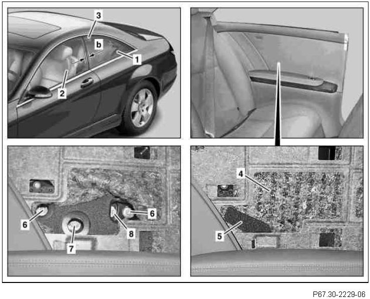 The rear side window (1) should make contact at the front of the power window mount.Adjust parallel to retaining rail on roof frame seal (3) by raising or lowering at the rear lift support point.