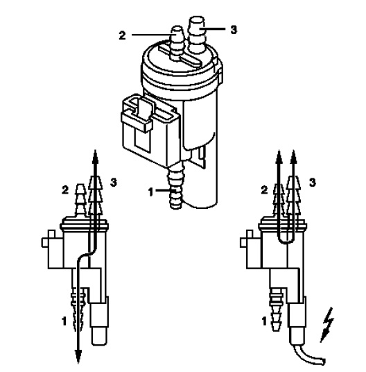 When actuating, the anchor plate (a) is pulled by the solenoid (d) and the sealing rubber (f) closes the aeration. The connection between port 2 and port 3 is opened. Thus there is a vacuum built up from the intake pipe to the aspirator shutoff valves. In the deenergized state the connection between port 1 and port 3 is reestablished and air is thus admitted to port 3.