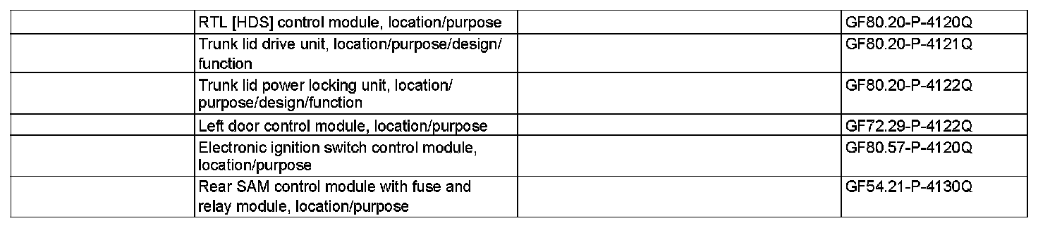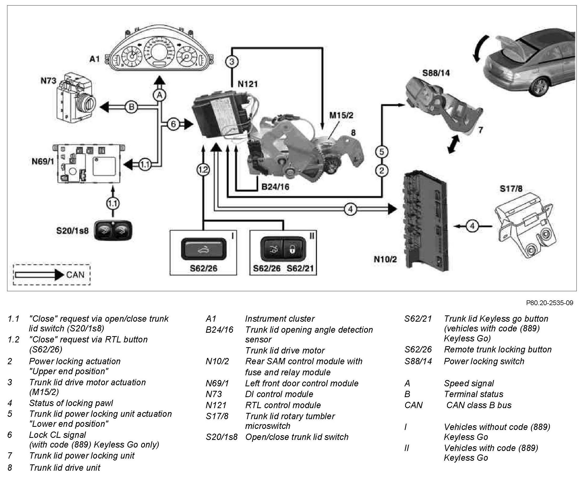 5 The signal of the trunk lid rotary tumbler microswitch (S17/8) is transmitted to the RTL control module (N121) by the rear SAM control module with fuse and relay module (N10/2) via the CAN class B bus. Then this motor actuates the trunk lid power locking unit (7) until the striker eye is in the lower end position.