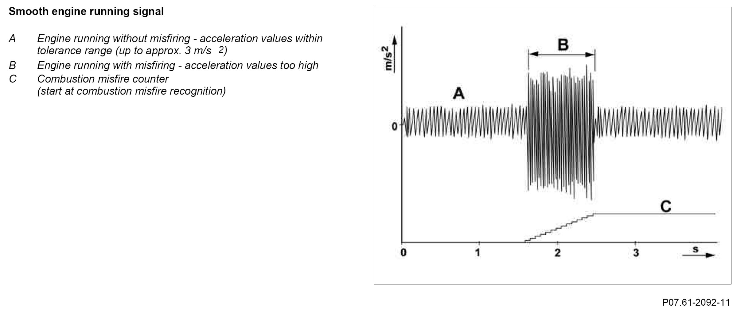 Each individual combustion must produce a characteristic acceleration at the flywheel. In case of combustion misfiring, the flywheel mass rotates slightly slower until the next ignition (short variations in torque).
