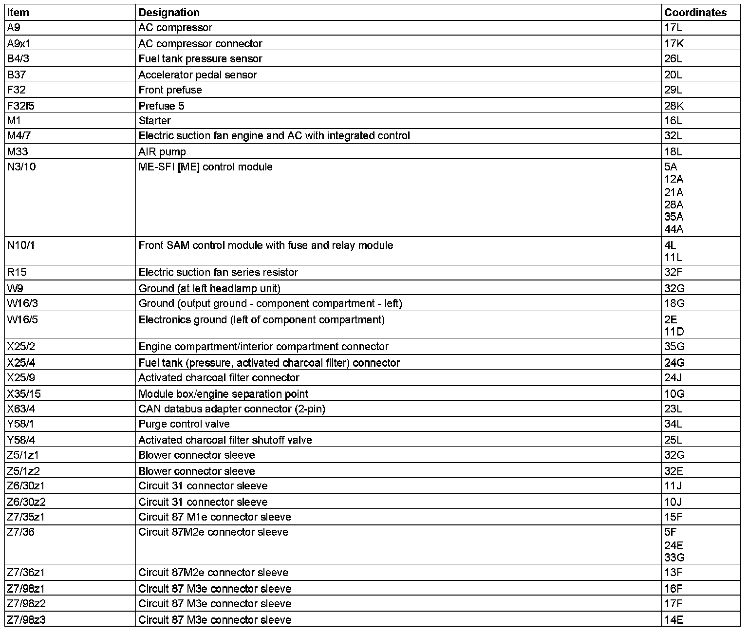 Component Description/Coordinates, A9 To Z7/98z3: