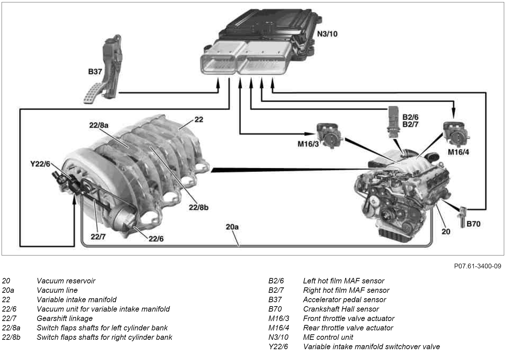 The variable intake manifold switchover valve is actuated at the ground end from the ME control unit and switches the vacuum from the vacuum reservoir through to the vacuum unit. The vacuum unit closes the switch flaps via gearshift linkage, which close off the short intake routes.
