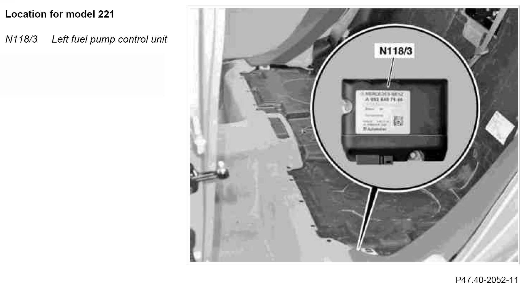 Fuel pump control unit is located in the left footwell in front of the 2nd seat row.