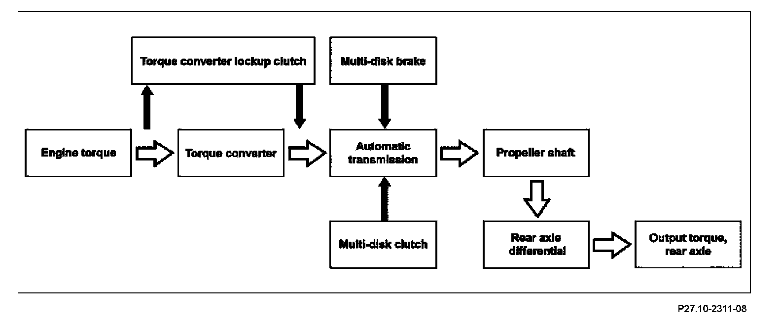 The term "power flow" refers to the transmission paths of driving power and engine torques. The engine torques are transmitted to the drive wheels via the mechanical-hydraulic connection of engine, torque converter, the downstream automatic transmission and rear axle differential.