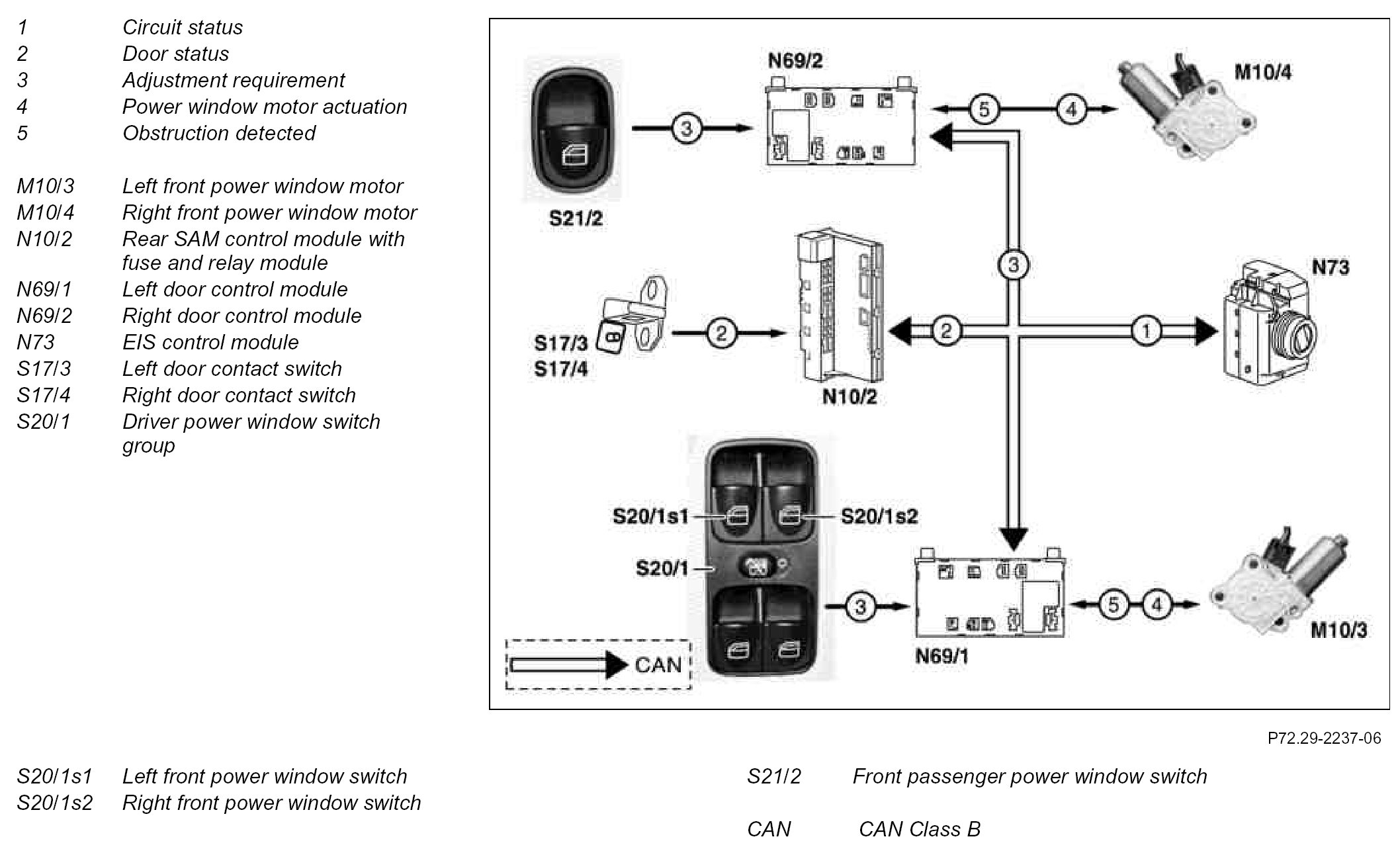The windows can still be opened or closed for 5 min. after switching off circuit 15R as long as the doors are not opened. The valid door status (door open or closed) is transmitted to the rear SAM control module with fuse and relay module (N10/2) by the left door contact switch (S17/3) and right door contact switch (S17/4), which then relays the information to the CAN class B bus.When a door is opened or the vehicle is locked all active power window functions are terminated