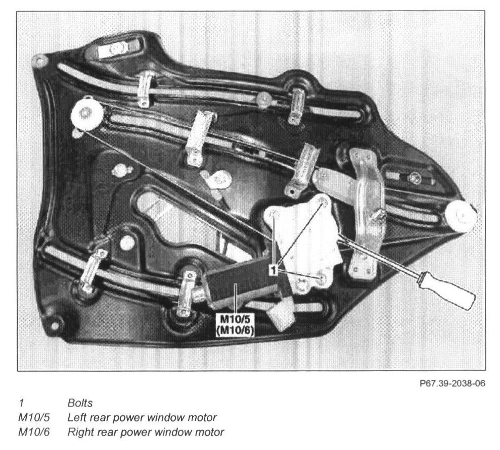 - Left rear power window motor (M10/5), or right rear power window motor (M10/6).