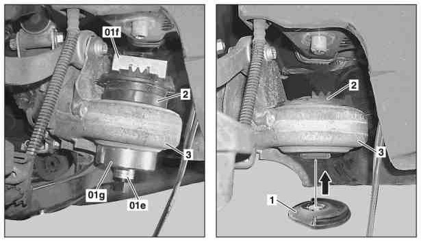 5 Press rubber mount (2) out of rear axle carrier (3) by turning in the spindle (01e).