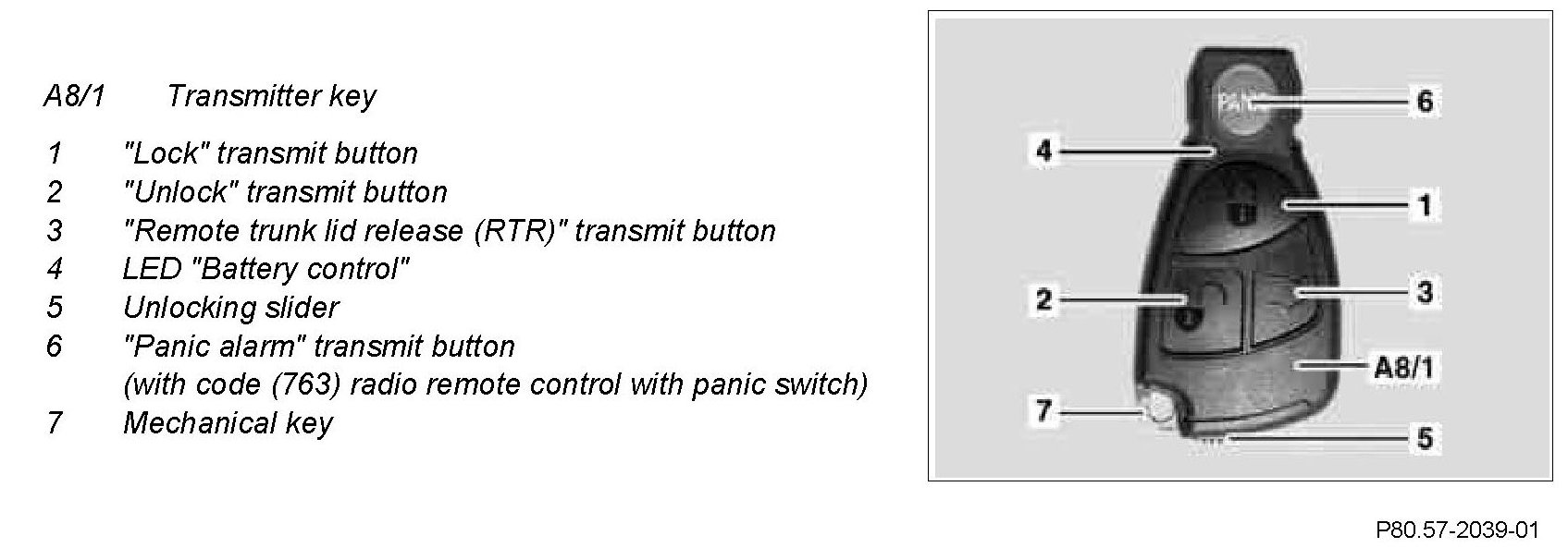 The mechanical key (7) can be removed from the transmitter key after actuating the release slider (5).When the driver's door is unlocked with the mechanical key (7) the CL is not actuated.
