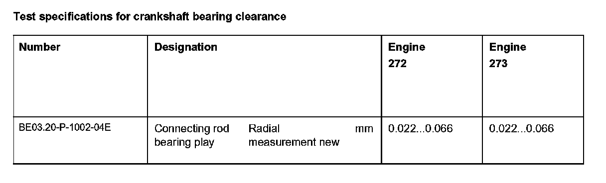 Test specifications for crankshaft bearing clearance: