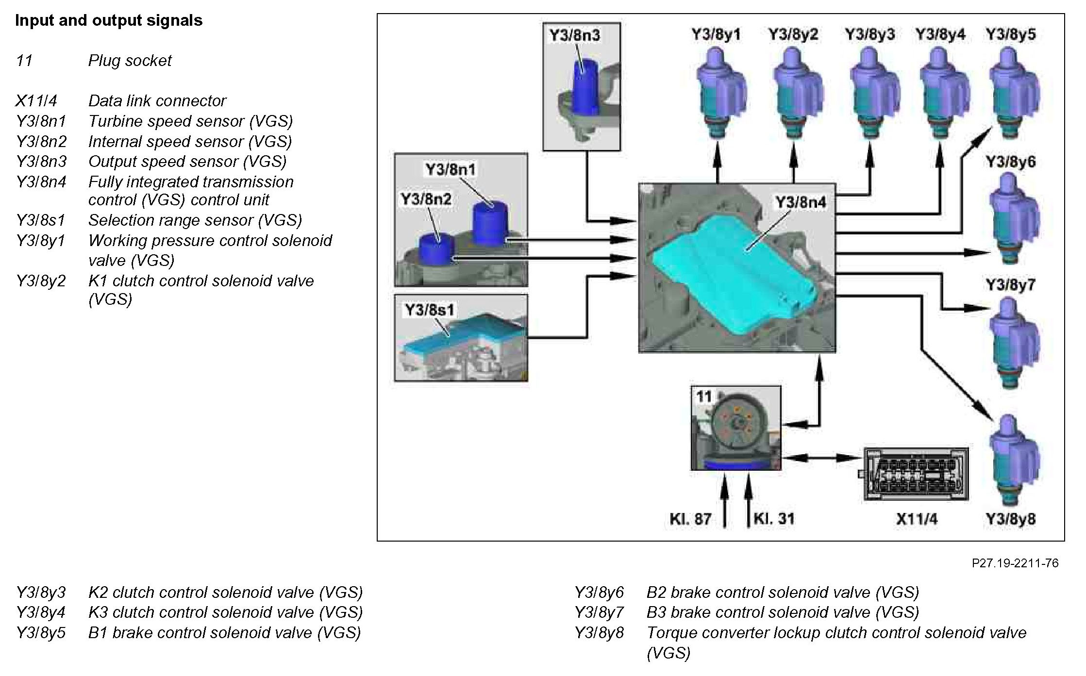 The fully integrated transmission control (VGS) control unit (Y3/8n4) actuates the following control solenoid valves depending on the processed input signals: