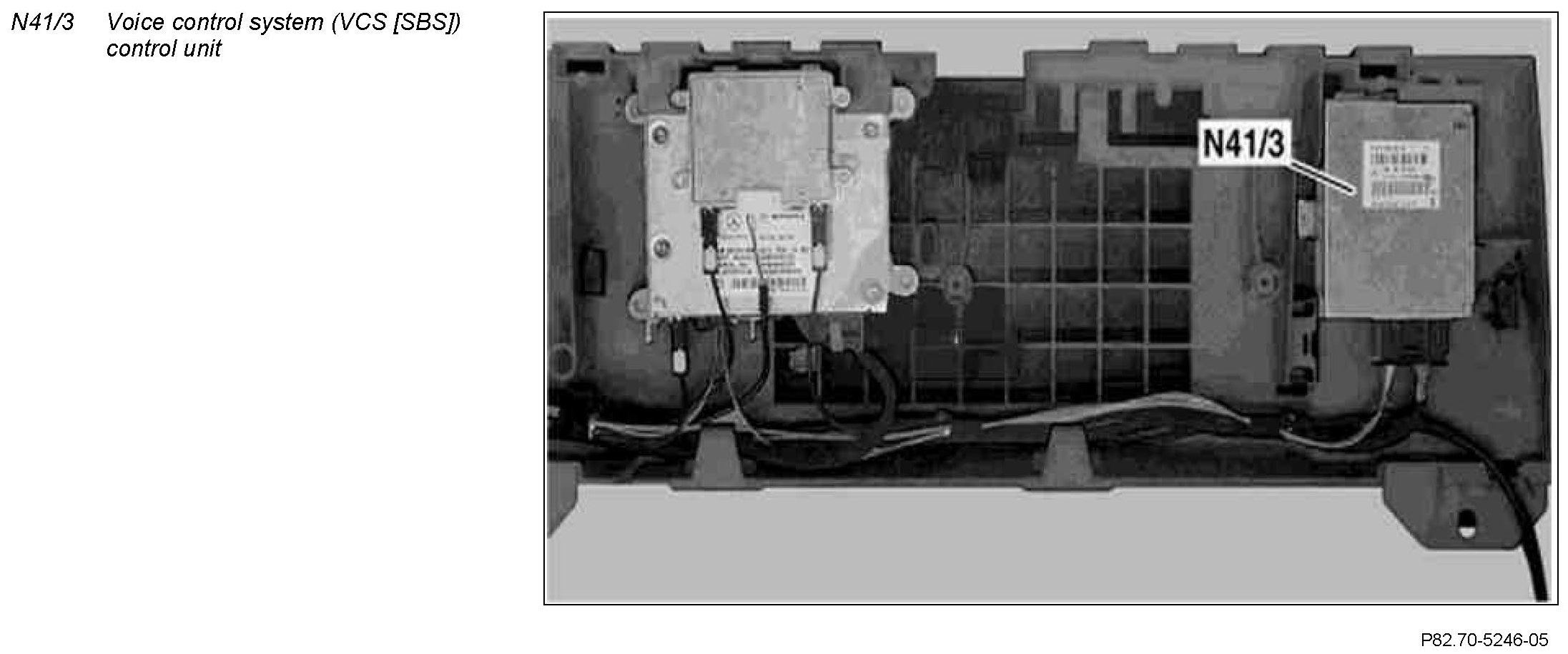 The voice control system control unit (VCS [SBS]) essentially consists of 3 subareas. One area is connected to the Media Oriented System Transport (MOST) for communicating with other control units. This area converts the optical input data into electrical signals and electrical signals into optical output data. The 2nd area reads in the 4 microphones of the hands-free system microphone group (A67b1) (up to 30.6.06) or the 2 microphones of the hands- free system microphone group (as of 1.7.06) and filters out the voice input of the user since this is interfered with by background noise such as air turbulence and rolling noise. The third area is the voice recognition system.