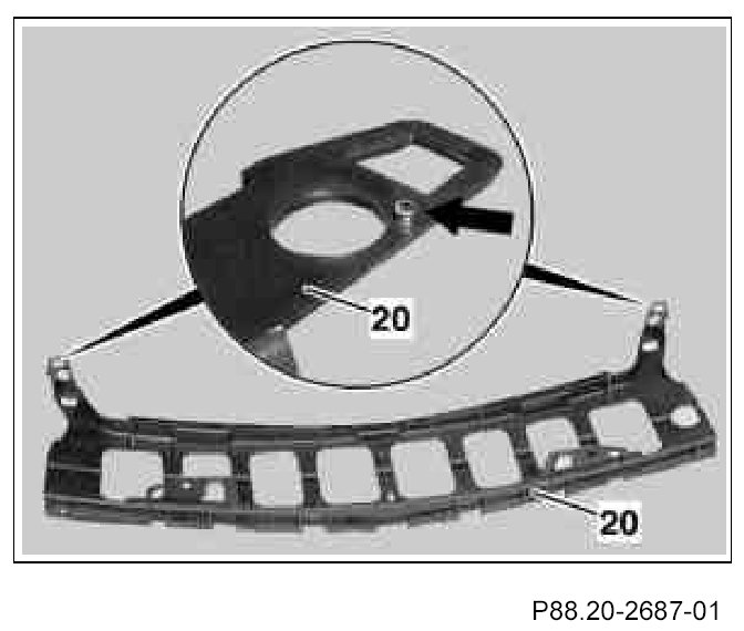 Ensure that inner center section (20) is seated correctly in area of engine hood connection on left and right (upper magnified section, arrow)