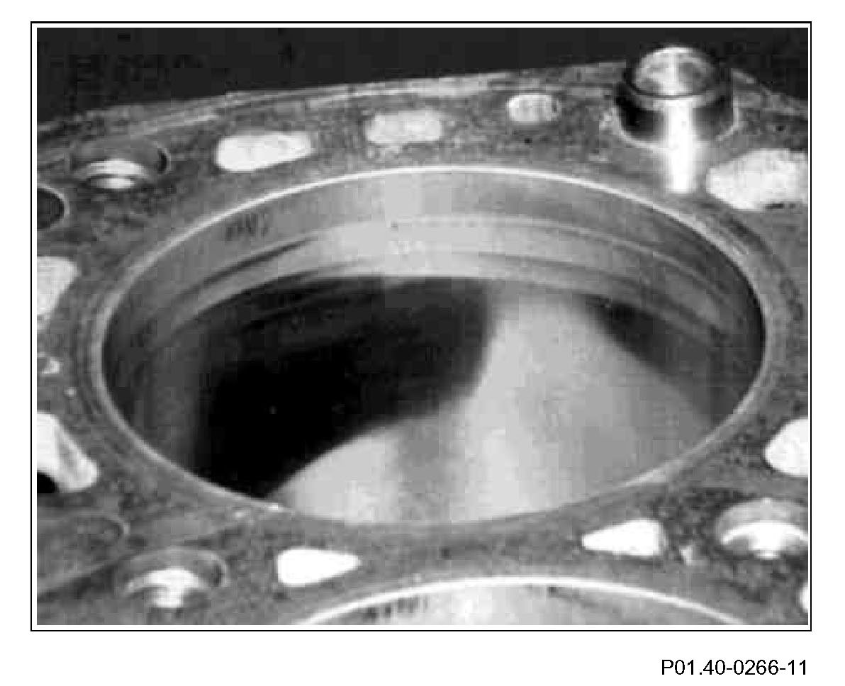 Starting from first piston ring, tapering to an end after about 30 mm. Traces of dry friction marks which cannot be felt, caused by oil film being washed off by fuel, e.g. during frequent cold starts associated with short-distance driving. These traces of friction marks which occur principally in area of cylinder head bolts and on pressure side are not a problem provided they are smoothed. The piston rings are not damaged. Reuse crankcase.
