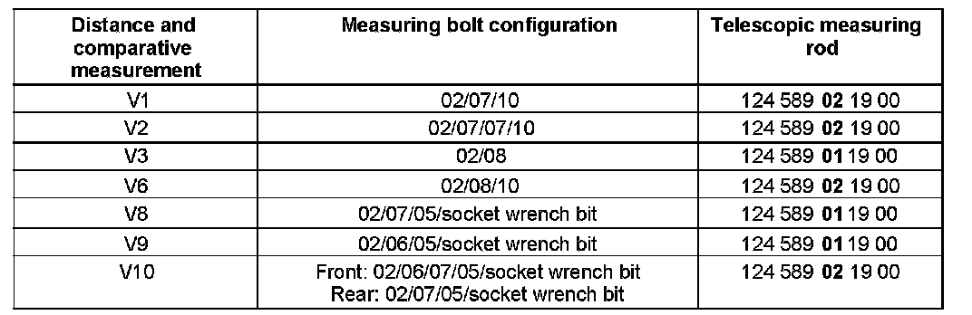 The configuration of the measuring bolts is shown in the table, where the digits in the column headed "Measuring bolt configuration" are the special tool end numbers. For example: 02/08/10 168 589 07 63 02 (support stud) 168 589 07 63 06 (extension) 168 589 07 63 10 (measuring tip)