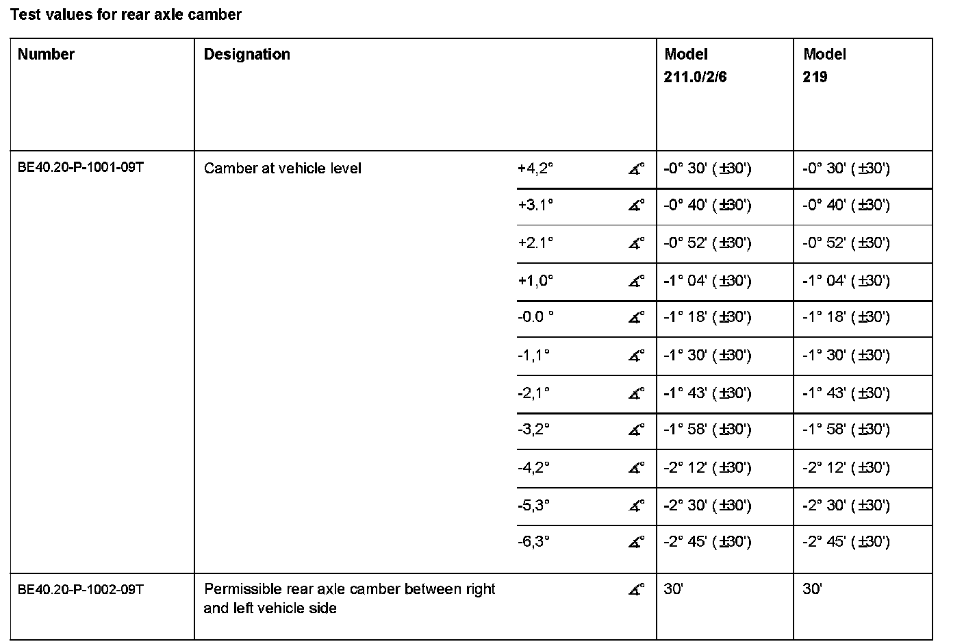 Test Values For Rear Axle Camber: