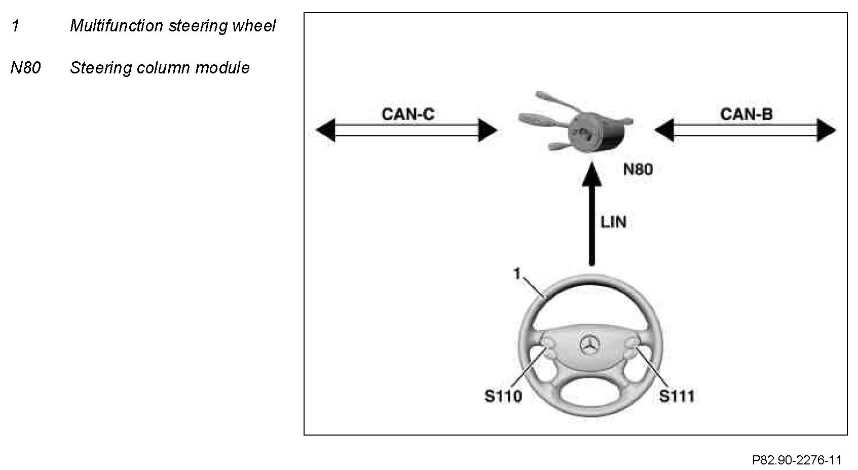 The signals are read in via the local interconnect network (LIN) bus of the steering column module (N80) and sent to the Controller Area Network bus Class B (interior) (CAN-B).