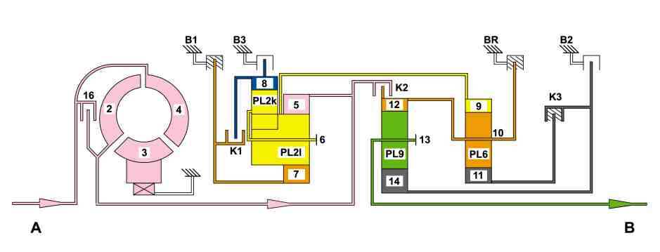 There is a connection between the sun gear (14) and sun gear (11) via the engaged multi-disk clutch K3 (K3). As a result sun gear (14) rotates at the same speed and direction of rotation as the sun gear (11) and drives the planet gears (PL9). The increased torque and reduced rotational speed as a result are transmitted via the planet carrier (13) to the transmission output shaft.