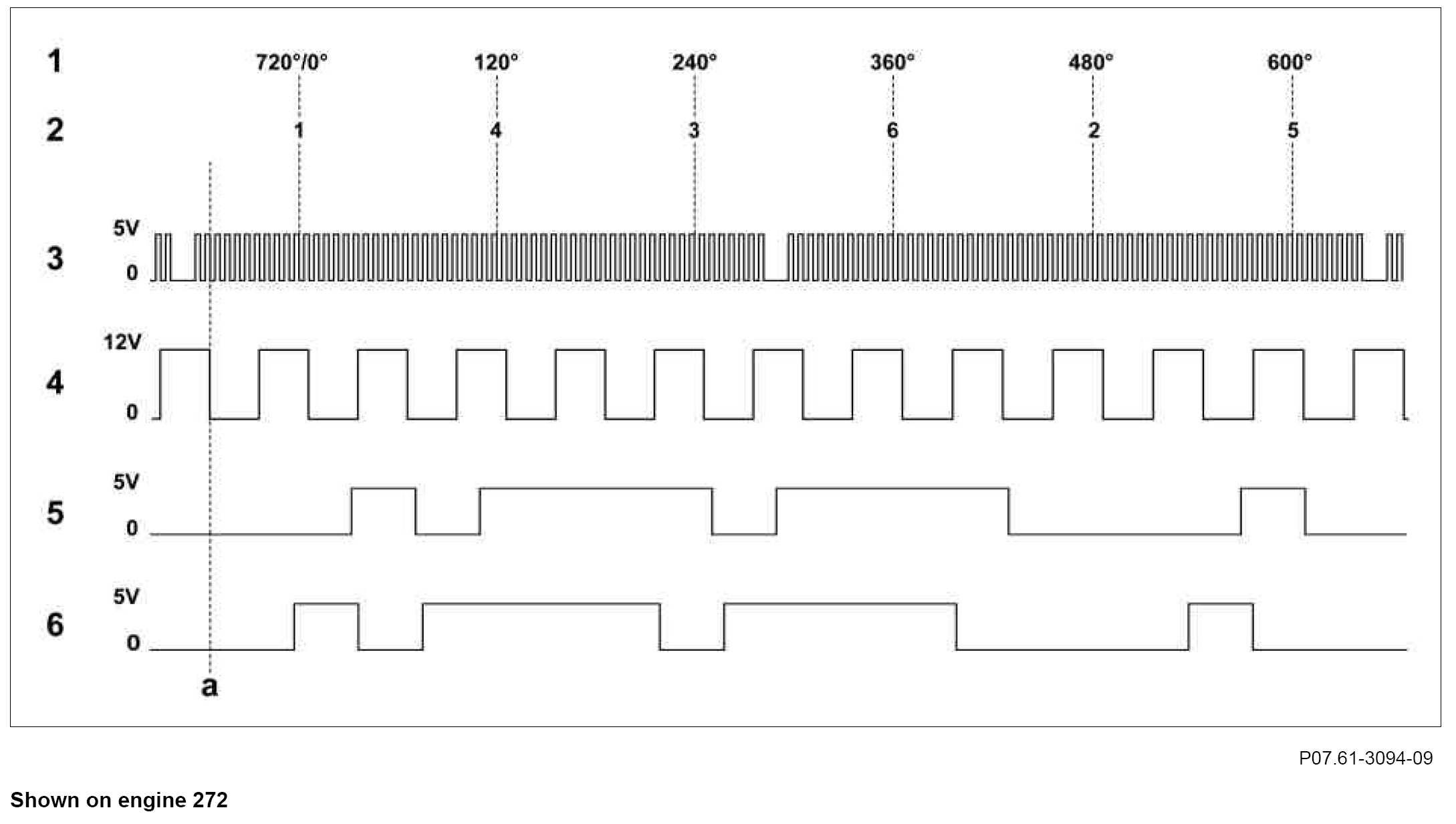 Four signals are generated per rotation of the camshaft whereby the signal switches between about 5 V ("HIGH") and 0 volt ("LOW"). If an opening in the pulse wheel is opposite the sensor, the signal is approx. 5 V.
