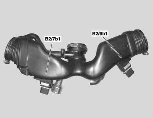 The intake air temperature sensors are integrated in the left hot film mass air flow sensor (B2/6) and the right hot film mass air flow sensor (B2/7) respectively.
