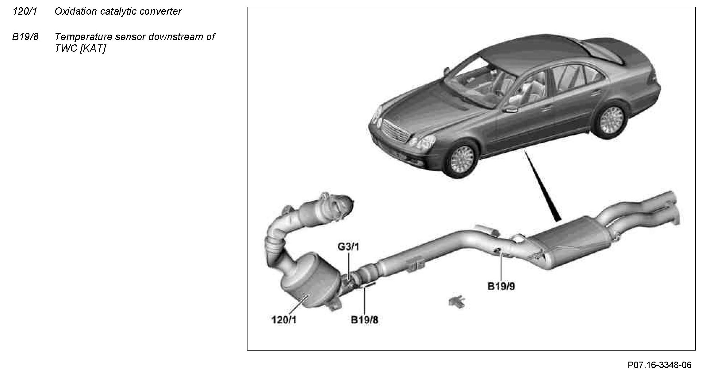 The temperature sensor downstream of the catalytic converter detects the current exhaust temperature upstream of the oxidation catalytic converter and sends an appropriate signal to the CDI control unit (N3/9).