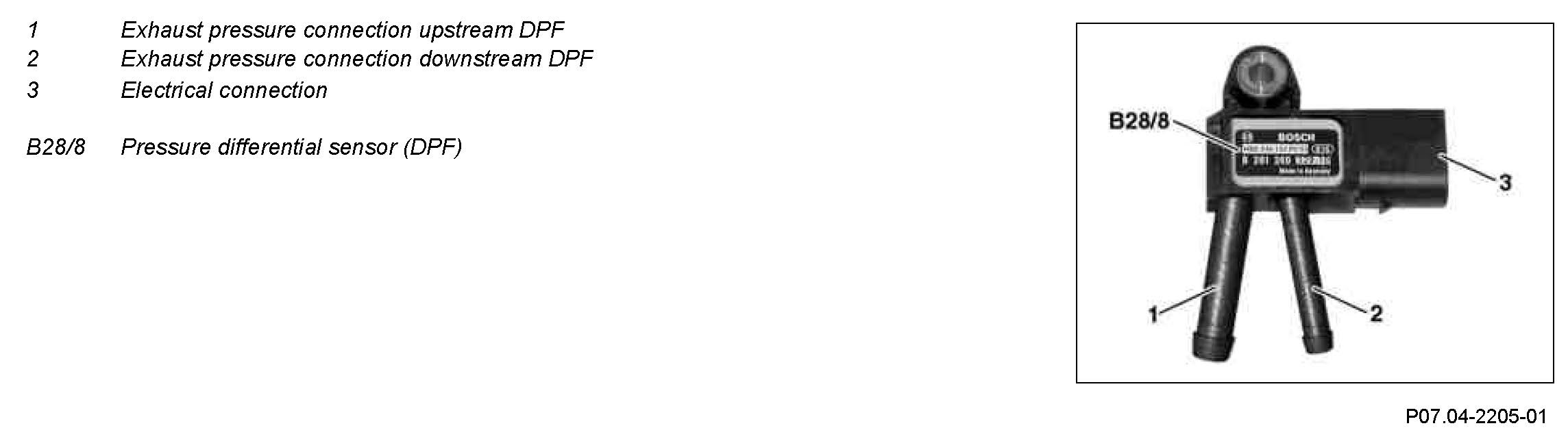The differential pressure sensor detects the exhaust gas pressure difference upstream and downstream of DPF via the exhaust gas pressure lines upstream of DPF and downstream of DPF.