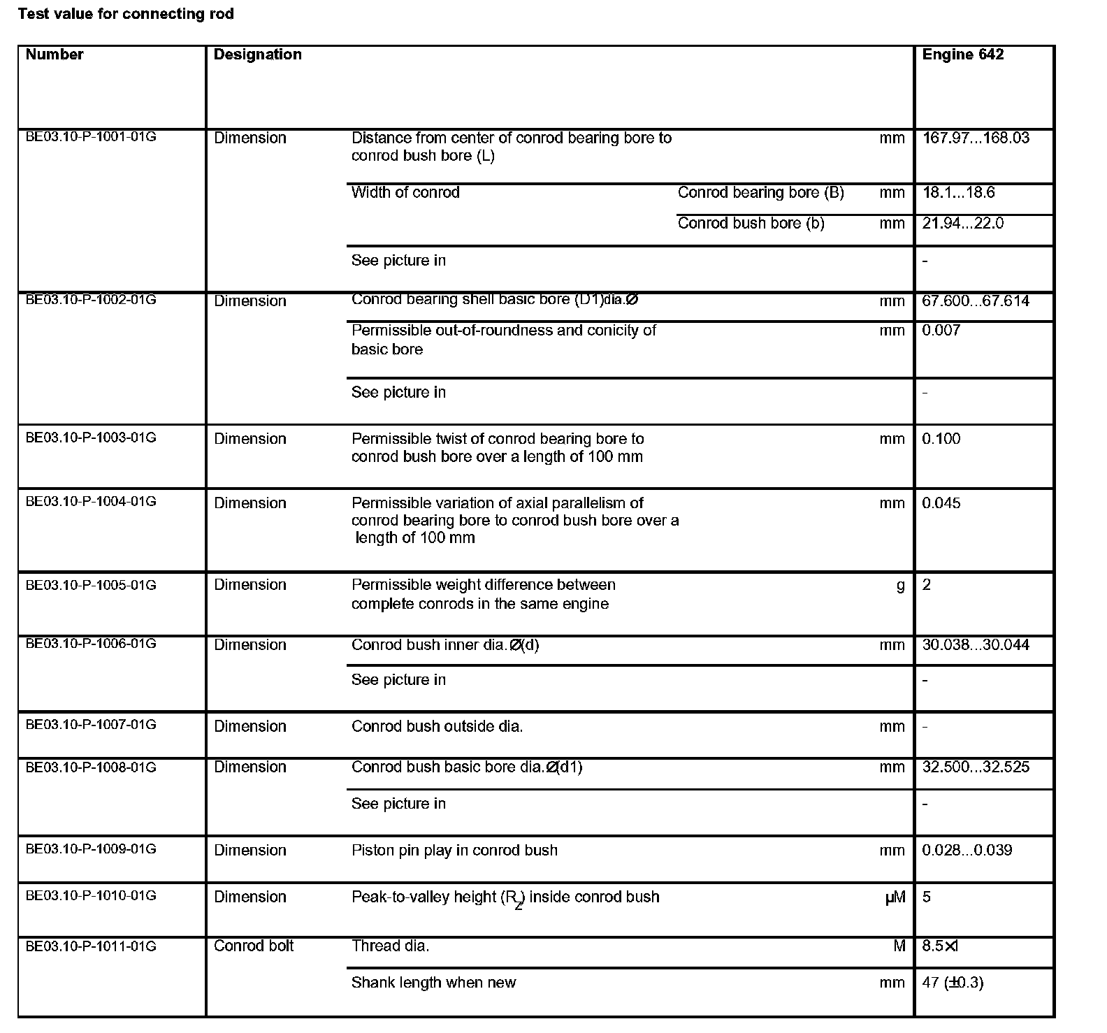 Test value for connecting rod: